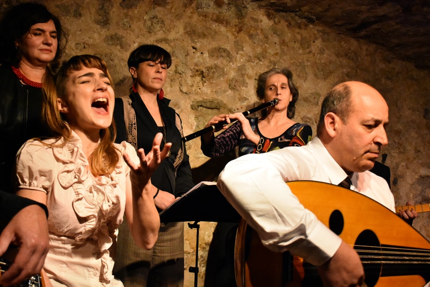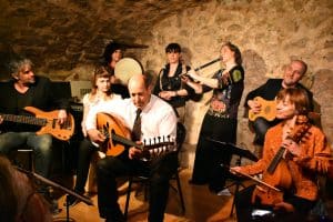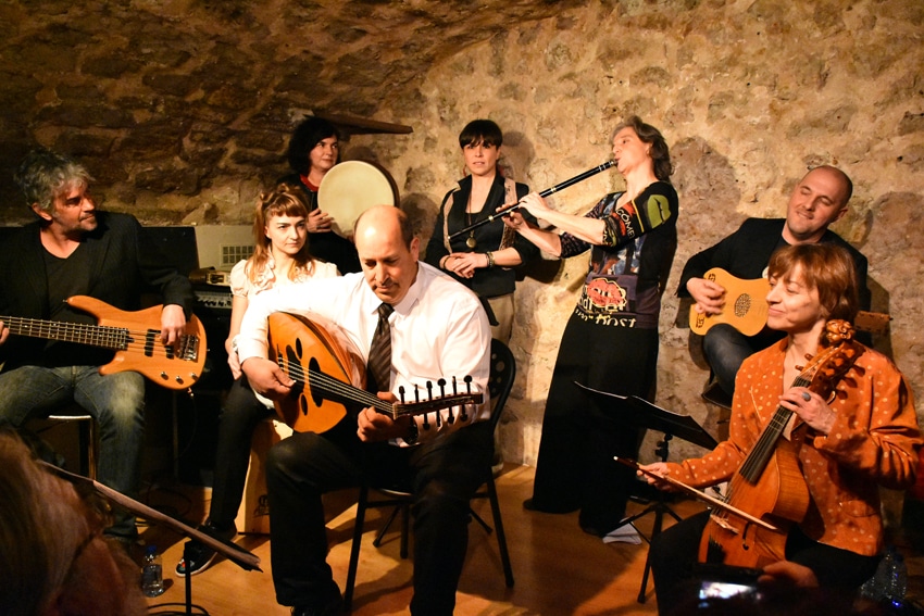 Bruno Allary à la guitare et au chant, Mireille Collignon aux violes de Gambe, Isabelle Courroy à la flûte Kaval, Fouad Didi au chant et Luth arabe, Philippe Guiraud à la basse, Carine Lotta, Sylvie Paz et Carina Salvado au chant et percussions. Une fusion qui procure un plaisir indescriptible pour les oreilles et les yeux.